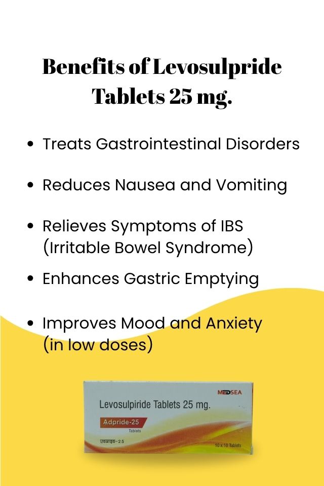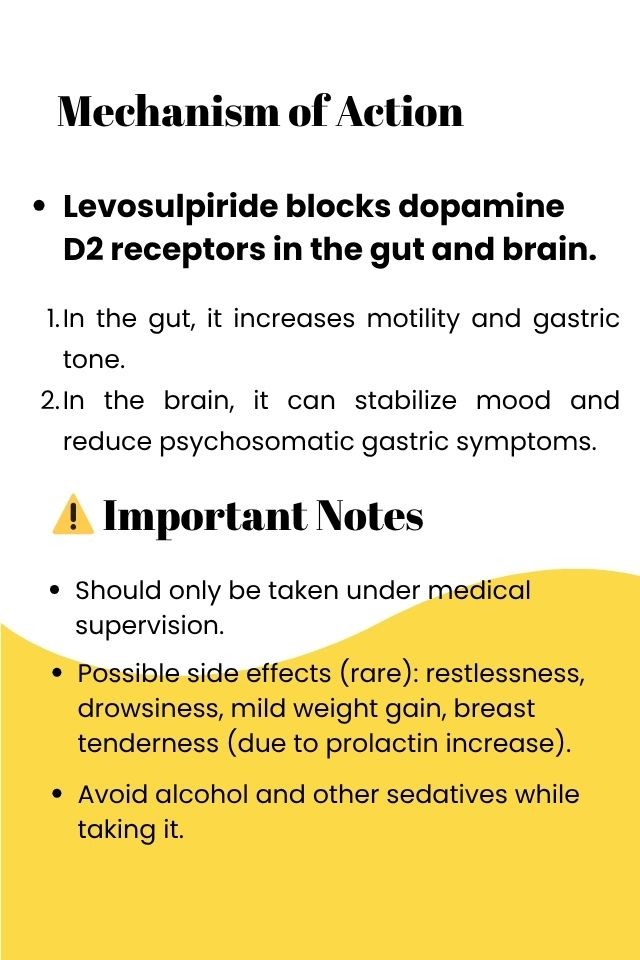 Levosulpride is formulated to regulate gastric motility and reduce gastrointestinal discomfort caused by indigestion or bloating. It works by enhancing stomach movement and promoting balanced digestive function. Additionally, it supports emotional well-being by maintaining healthy dopamine levels — ensuring both gut and mood balance.