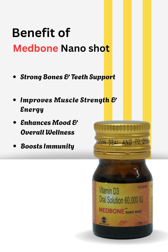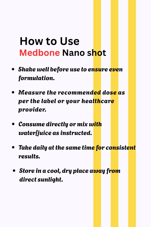 Medbone Nanoshot delivers a concentrated dose of calcium and Vitamin D3 in a nano-absorbable liquid form for faster and more efficient bone nourishment. It strengthens bones, supports joint health, and aids calcium absorption. Convenient and easy to take, it’s ideal for those needing quick bone support in a modern format.