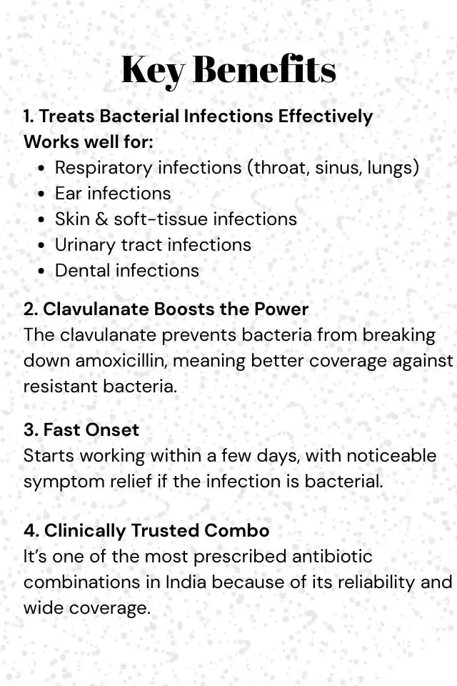 Moon-CV Tablet is commonly used for the treatment of infections such as respiratory tract infections, sinusitis, bronchitis, urinary tract infections (UTI), skin and soft tissue infections, ear infections, and throat infections. It may also be prescribed for conditions like pneumonia, gonorrhea, and Lyme disease when caused by susceptible bacteria.