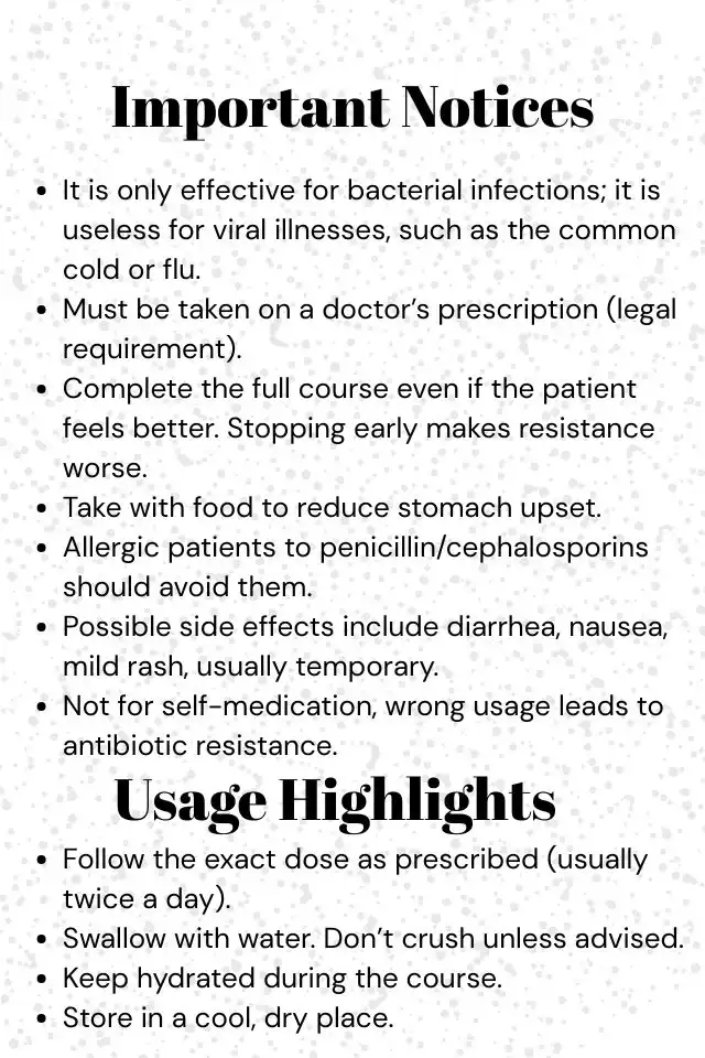 This antibiotic is effective against a wide range of gram-positive and gram-negative bacteria, helping reduce symptoms such as fever, inflammation, pain, and infection spread. Moon-CV should always be taken as directed by a physician, usually swallowed whole with water and not crushed or chewed. Completing the full prescribed course is important to prevent antibiotic resistance and ensure complete recovery.