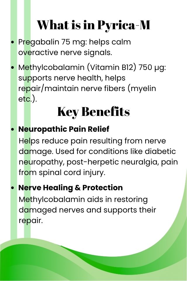 Pyrica-M is a specially designed formula that provides comprehensive nerve support and relief from neuropathic pain. Enriched with vitamins and antioxidants, it helps restore nerve health, reduce tingling or numbness, and improve overall neural function. Ideal for long-term nerve care and comfort.